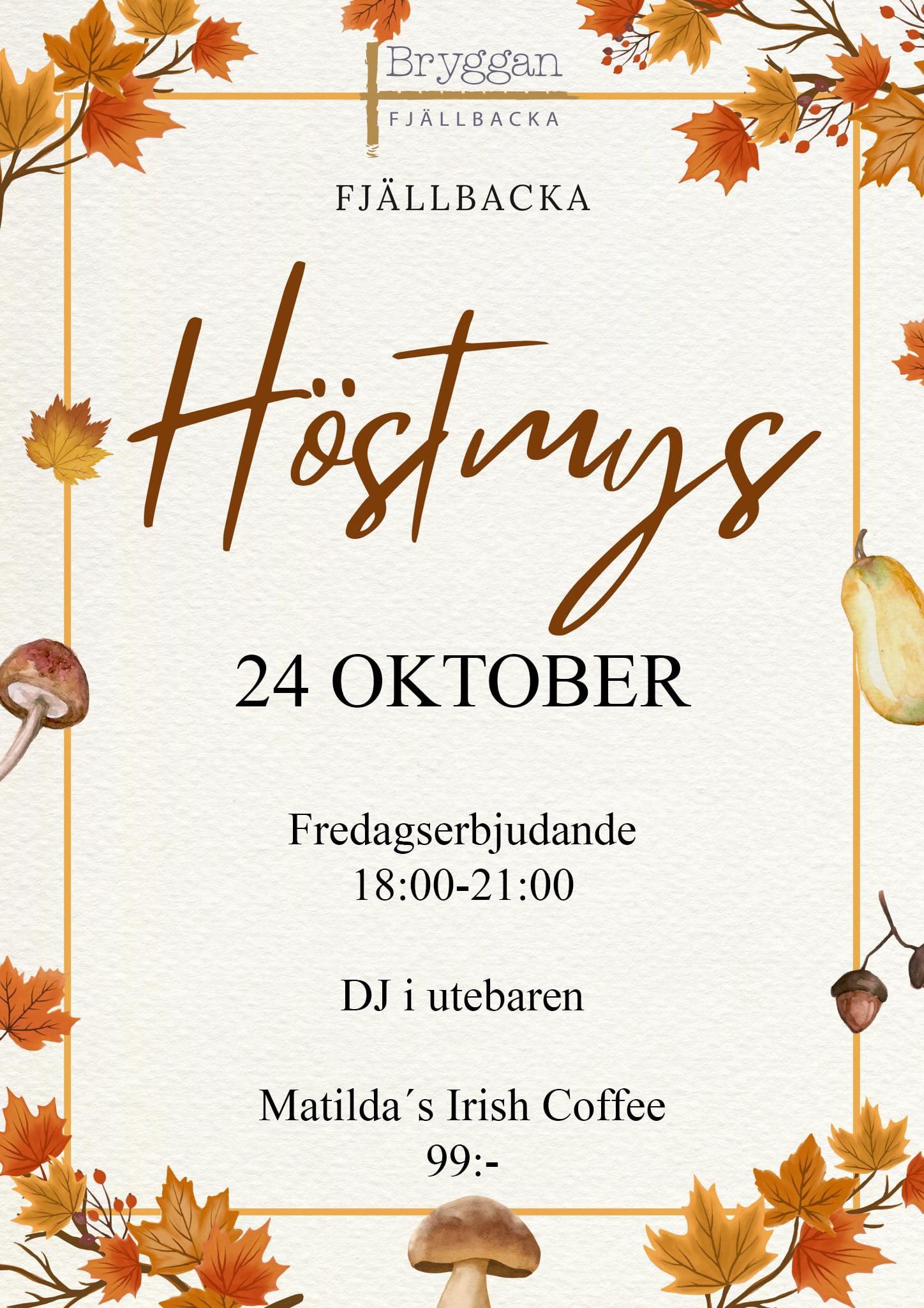 Höstmys i Fjällbacka Fredagen den 24/10 så är det HÖSTMYS i Fjällbacka. Detta innebär att både butiker och restauranger i byn håller öppet med fina erbjudanden. Detta är en av höstens absoluta höjdpunkter. Mer info om denna helgen hittar ni på sociala medier.